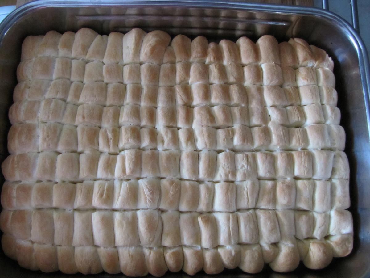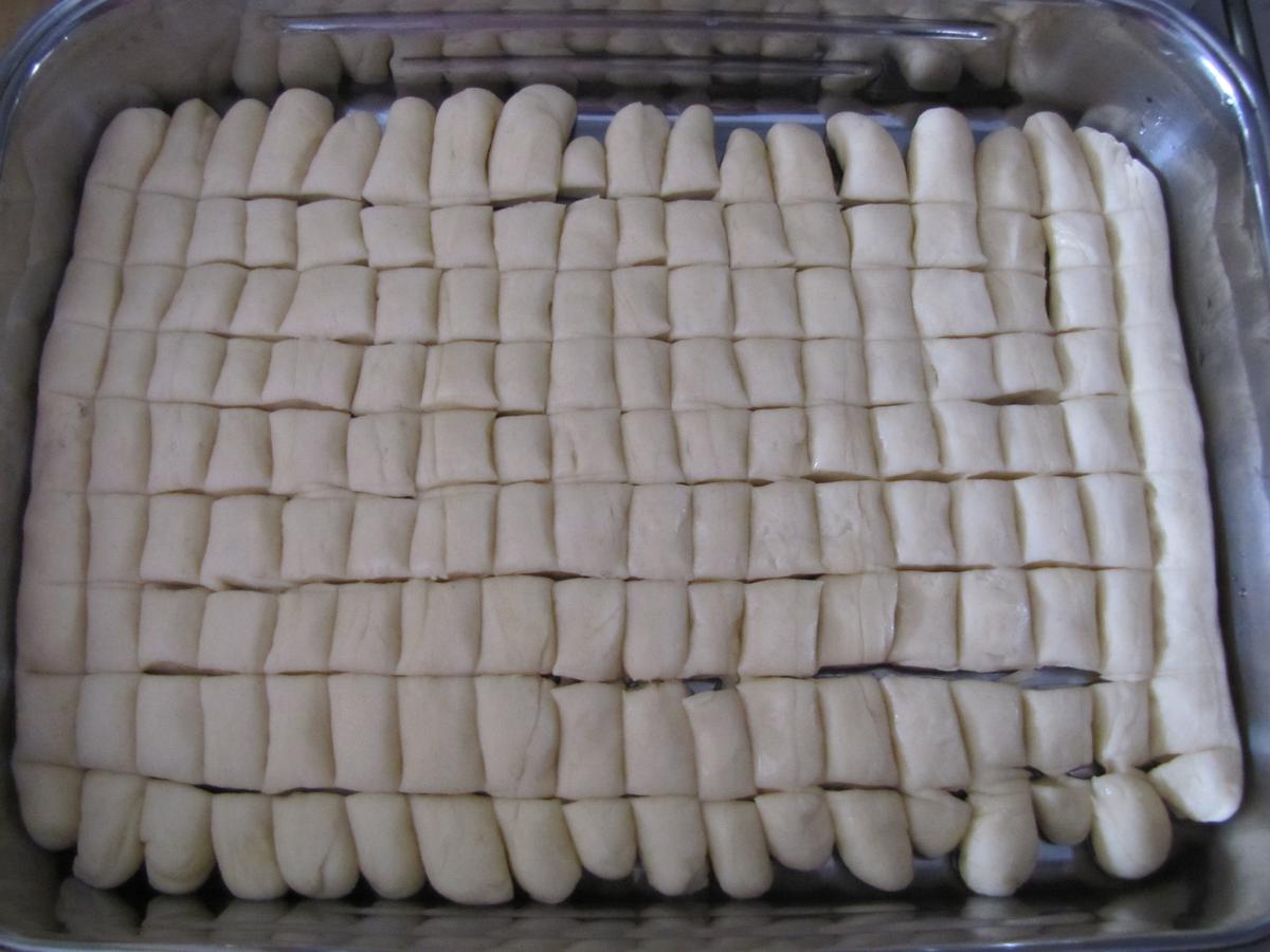 Na dámě jsem občíhla i fíhl na buchtičky. Z těsta se vyválí tenké válečky, které se naskládají vedle sebe do pekáče. Pak se jen překrojí a vzniknou malinké buchtičky.