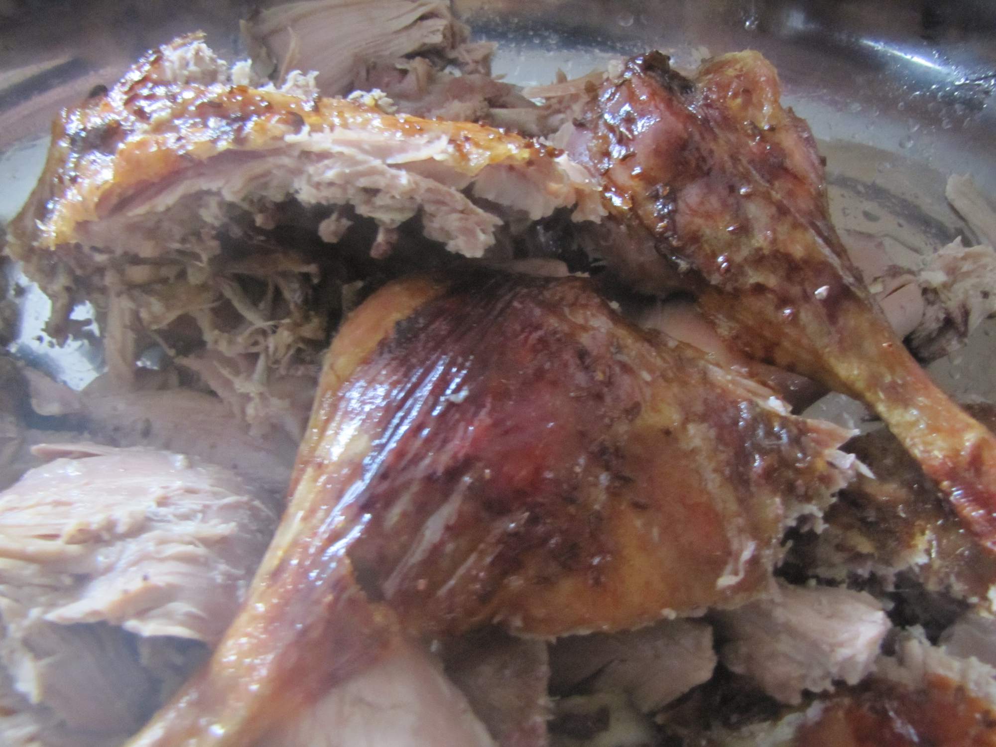 Nyní vložíme pekáč do trouby, kterou zapneme na 120 stupňů. Ti šťastnější si mohou na troubě nastavit začátek pečení, my co máme troubu bez časovače si hold musíme nachystat budík na 5.30 hod. ráno a troubu zapnout. Dobrá zpráva je, že se pak můžete opět svalit do postele, protože kachna vás dalších pět hodin nebude potřebovat. Po pěti a půl hodinách nastává fáze odkrytí kačeny. Nebojte - není na uhel, ale vypadá takto